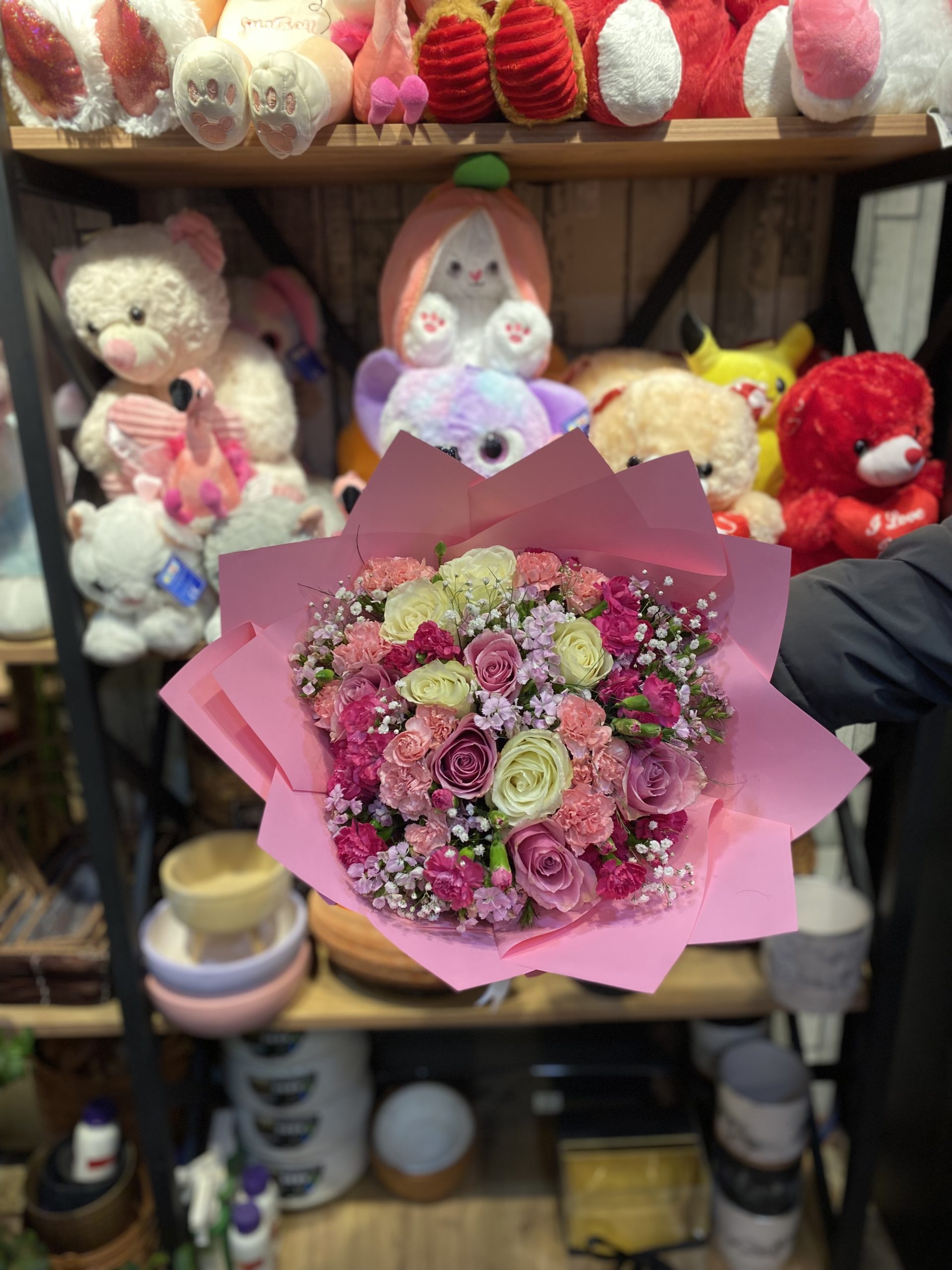 İthal beyaz pembe güller ve kır çiçeklerinin buluşması