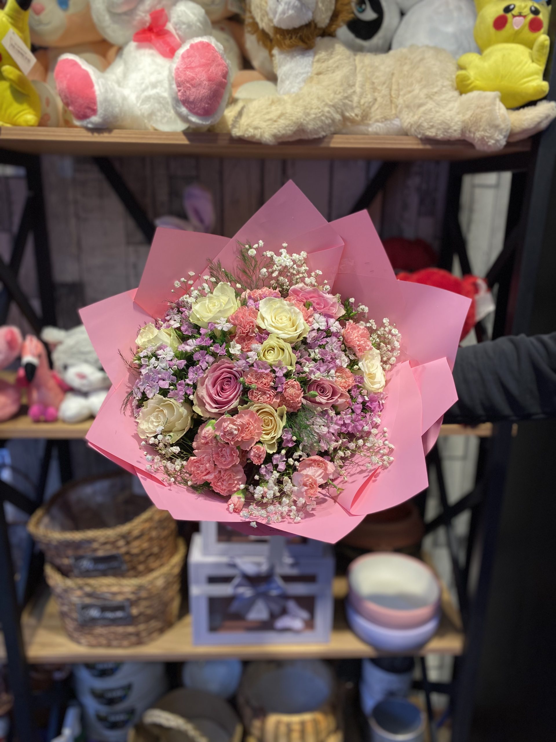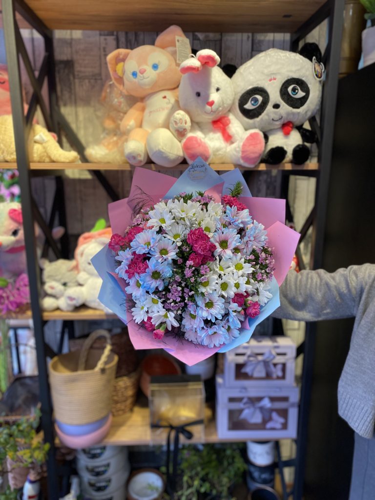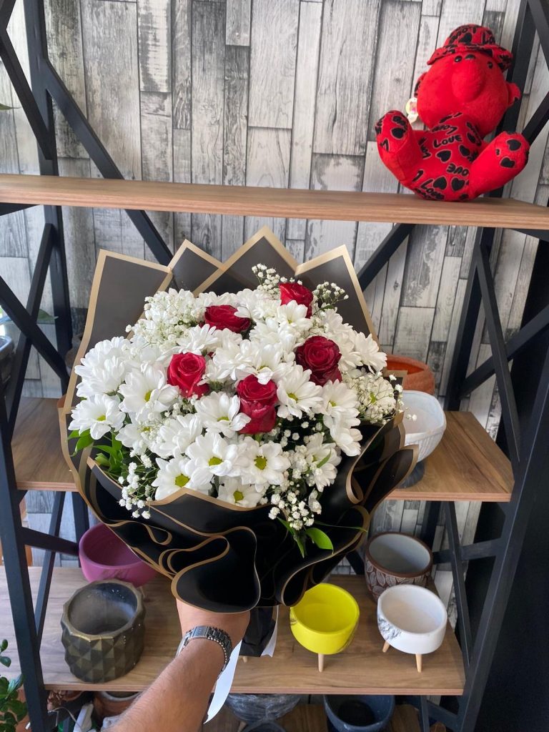İthal beyaz pembe güller ve kır çiçeklerinin buluşması