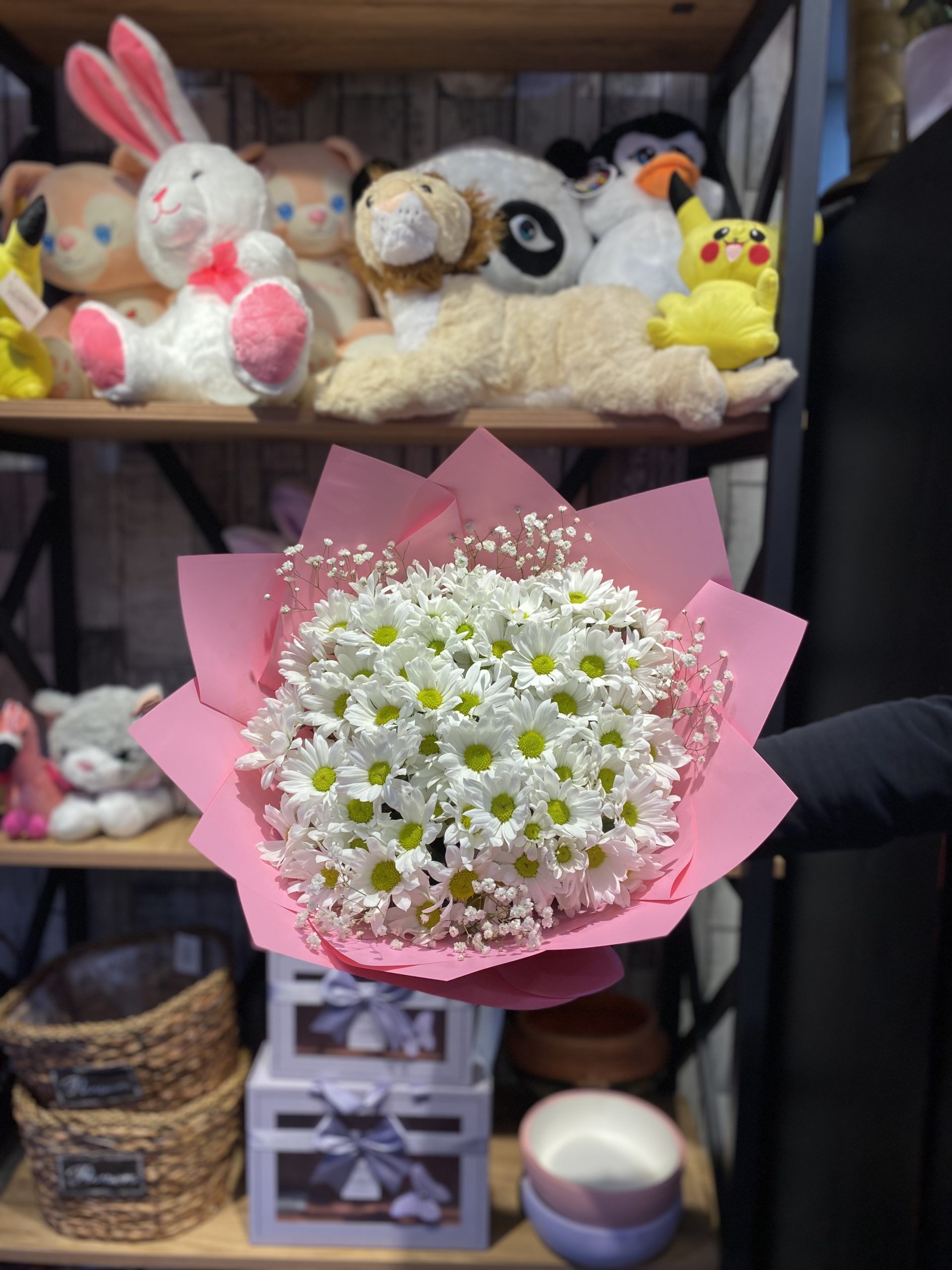Taptaze beyaz papatyalarla büyük boy buket